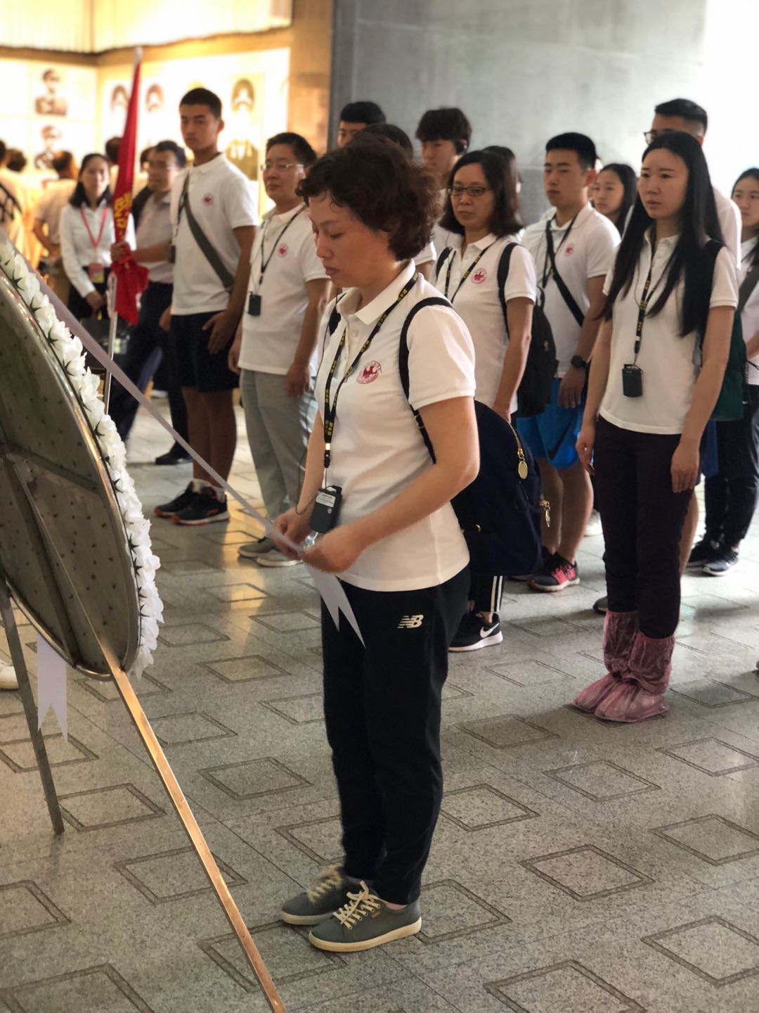 进入陵园的主大门,映入眼帘的横式牌坊园标“井冈山革命烈士陵园”烫金大字。登上宽阔的台阶即进入纪念堂,纪念堂大门上方烫金横幅“井冈山革命根据地革命先烈永垂不朽”。纪念堂设有瞻仰大厅、陈列室、吊唁大厅、忠魂堂。全体师生来到了瞻仰大厅,向长眠于此的革命烈士们敬献花篮表达敬意,滕艳丽院长整理挽联,全体肃立,在滕艳丽院长带领下,全体师生三鞠躬表达对革命先烈的崇高敬仰。
