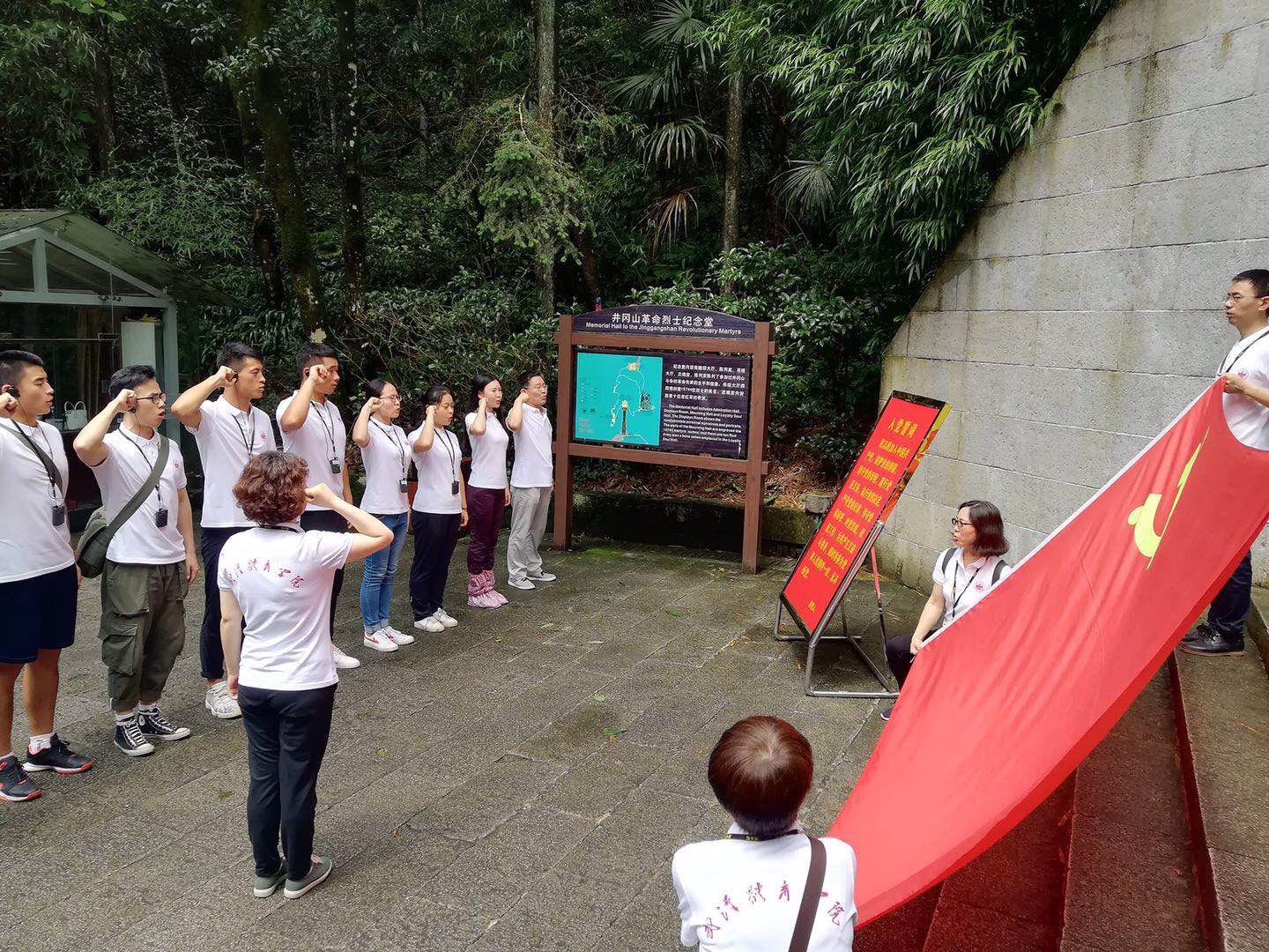 在苍翠茂密的青松翠柏掩映下,全体党员师生举起右手,再次重温了入党誓词。井冈山革命先烈在引兵井冈后被重重包围的艰难境地中,依然坚定执守革命理想信念和对共产主义的信仰,不畏牺牲,誓死战斗到底。这种“革命理想高于天”的信念对全体党员来说是一次特别的党性教育。